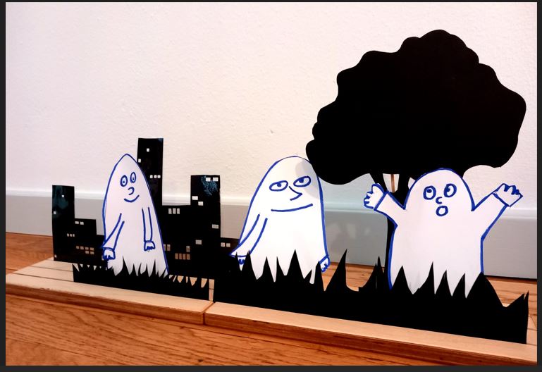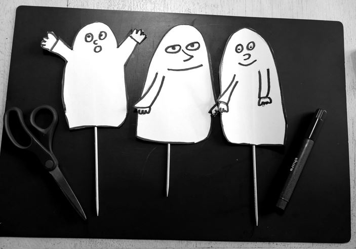 Oder mit selbstgebastelten Stabfiguren geistern gehen: Geister werden gemalt, ausgeschnitten und auf Holzstäbe oder Papierstreifen geklebt. Eine Taschenlampe dazu – und schon kann draußen in der Dunkelheit gespenstisch herumgegeistert werden!